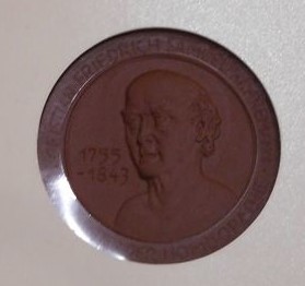 Отдадим должное представителям германского Мейсена, где трудился отец гения медицины, и где был рождён сам С. Ганеман. Они не только повторили в бронзе первую прижизненную памятную медаль С. Ганемана из Эрлангена (1829 года, в честь увековечения диссертации доктора медицины; отлитую медальером Крюгером – K.R. Kruger – Рис. 9), но и выпускали (с 1922 года по 2012 год) 7 разновидностей ганемановских памятных медалей, разного диаметра и с разными текстами, - из фарфора, майолики, майолики или фарфора с позолотой (Фото А,В). Но все они, традиционно содержат главный логотип (и клеймо) мейсенской фарфоровой мануфактуры – два перекрещенных меча. Медальер большей части этих изделий – E.F. Schwarzbach. Разумеется, на фарфоровых изделиях эти мечи сине-голубые (это отчётливо видно в коллекциях Д.В. Попова-старшего и его семьи; Т.Д. Попова, на одном из Конгрессов гомеопатов в Одесском Доме Учёных, презентовала мне мейсенского трубадура); однако, на медалях они слиты с цветом самого материала (серебро, фарфор, шамот, майолика).