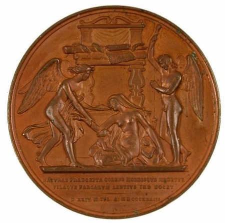 И, завершая «лионскую» тему, не могу не упомянуть одно из украшений моей коллекции – медаль в честь многоорденоносного и разностороннего графа Себастьяна де Гвиди (Comte Seastien Gaeten Salvador Maxime des Guidi, 1769-1863). Доктор, профессор, математик, механик, химик, инспектор учебных заведений, физик и философ, он был не только пациентом, но и одним из преданнейших учеников великого С. Ганемана. Он получал поручения и награды от многих венценосных особ, смог в жизни организовать и сотворить многое, но стал почитаем в мире гомеопатии; общался с выдающимися врачами (и не только гомеопатами) своего времени. Медную медаль диаметром 51 мм и весом 76,22 грамма, заказал у почитаемого гравёра-медальера В.М. Борреля (Valentin Maurice Borrel, 1804-1882) в его честь один из наследников Луи-Филиппа, в 1835 году. Известны отливки медали 1842-1845 гг. На аверсе – профиль графа Гвиди, и надписи: «MIRE SANATI GFRATITUDINIS MEMO-RES.. SIMILIA SIMILIBUS/LUGD./MDCCCXXXV.». На реверсе – концентрический венок победителя, обвитый змеёй, а в центре – надпись «L’AN 1830./ L’HOMEOPATHIE/ A ETE INTRODUITE A LYON / ET PROPAGEE EN FRANCE./ PAR/ LE DOCTEUR C. SEBASTIEN/ DES GUIDI..» (Рис. 3).