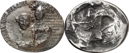 В завершение германской темы. В 2001 году одна из художественных студий Берлина (Studium d. Architektur an der Kunsthochshcule Berlin-Weissensee) решила взять эскизы медалей Франциски Шварценбах (отлитых несколько раз, последний – в 1949 году), и дать студентам с супервайзерами «заработать» на изображениях С. Ганемана и Мелани Ганеман, в бронзе и серебре. Наверное, создатели одной из германских современных мастерских решили «поизголяться» над памятью С. Ганемана и его супруги, и выпустили в свет несколько абсолютно уродливых «творений по металлу» - в бронзе и серебре. На них и сам создатель гомеопатической медицины (без спутницы), и вместе с Мелани д’Эрвильи-Гойе, и Г-жа Мелани Ганеман в одиночестве. Всё это не просто грязно отлито, но ещё и с ужасно «нацарапанными» подписями (Рис. 23)… Такое ощущение, что это были «пробы пера» подмастерьев в обучающих центрах по типу советских ПТУ, а пресс-формам не хватило многого… Следует полагать, отливка форм не привела к достойным параметрам и качеству… Автор данного материала выбрал две из 32 медалей для коллекции (очевидно более эстетичные). Как ценитель изящного, считаю такие работы недобросовестными и недалёкими, однако, обязан упомянуть в тематическом материале.