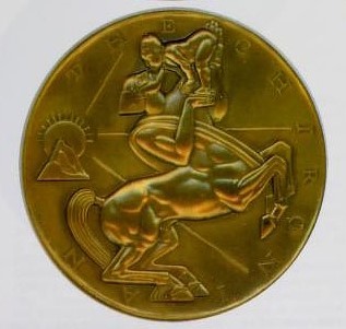 В 1957 году, в США, была отлита, пожалуй, красивейшая из современных медалей памяти основателя гомеопатии (Рис. 37). В руководстве Нью-Йоркского медицинского колледжа, по-видимому, решили исправить ошибки: 1) указанную автором в первой части данной статьи (отсутствие образа С. Ганемана в коллекции медалей великих медиков); 2) ошибку медицинского образования в США, разрушившего преподавание гомеопатии в первой четверти ХХ века. Итак, в мастерской того же А. Бельского (Abram Belskie из «Medallic Art Company»), деканат колледжа, заказал отливку медали «New-York Medical College of the Alumni». На аверсе медали – профиль С. Ганемана, смотрящего влево, в окружении современных зданий колледжа, под профилем – надпись «IN RECOGNITION OF/DISTINGUISHED SERVICE/», и концентрическая надпись «NEW YORK MEDICAL COLLEGE MEDAL OF THE ALVMNI», на реверсе – родоначальник всех медицинских хнаний мифологический кентавр Хирон с ребёнком, и солнце, восходящее из-за гор, и освещающее всё своими мощными оздоровляющими лучами света. Тираж медали неизвестен; диаметр 76,2 мм.