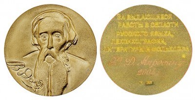 Большая Золотая Медаль В.И. Даля РАН, диаметром 50 мм, вручаемая с 1994 года один раз в пятилетку, была учреждена 23.02.1994 года. На её аверсе – изображение В.И. Даля в анфас, с его факсимиле, тогда как на реверсе – надпись «За выдающиеся работы в области русского языка, лексикографии, литературы и фольклора» (Рис. 51).