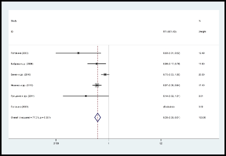 Тест на гетерогенность: Q = 17.64 (d.f. = 4) p = 0.001. І2=77,3%. Для определения суммарного относительного риска неэффективности терапии применяли модель с фиксированными эффектами. Суммарное логарифмизированное соотношение рисков (RR) при сравнении Дисменорма с группой сравнения RR=0,393(95% ДИ 0,30–0,509; (рис. 1), что свидетельствует о превосходстве эффективности Дисменорма (p=0.0001) при купировании болевого синдрома и лечении предменструального синдрома (ПМС).