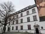 У ФАСАДА АРХИЕПИСКОПСКОГО ДВОРЦА с «КУСОЧКОМ» РИМСКОГО ДВОРЦА ВЕЛИКОГО ИМПЕРАТОРА (ТРИР, ГЕРМАНИЯ, ЯНВАРЬ 2026 ГОДА)